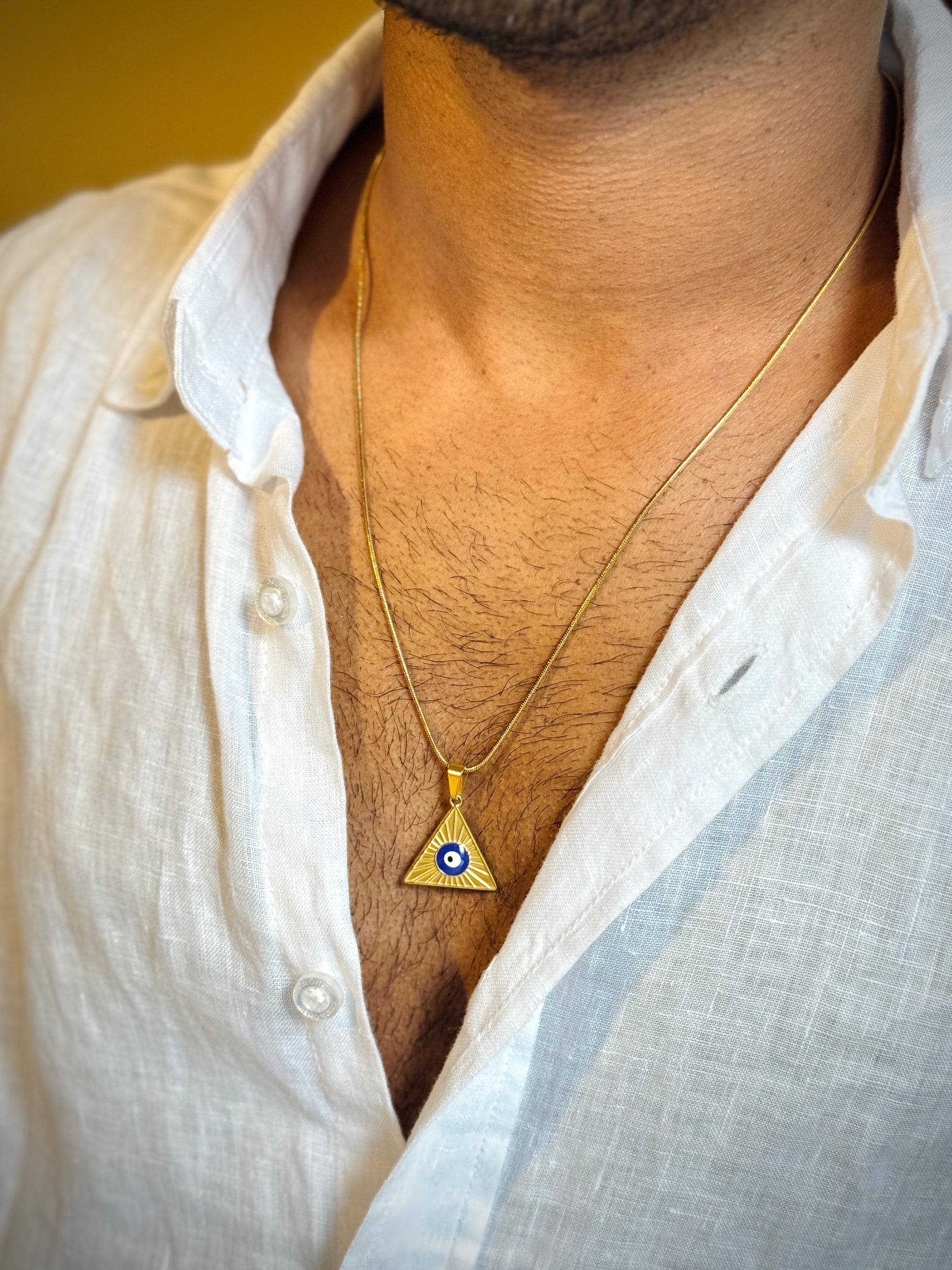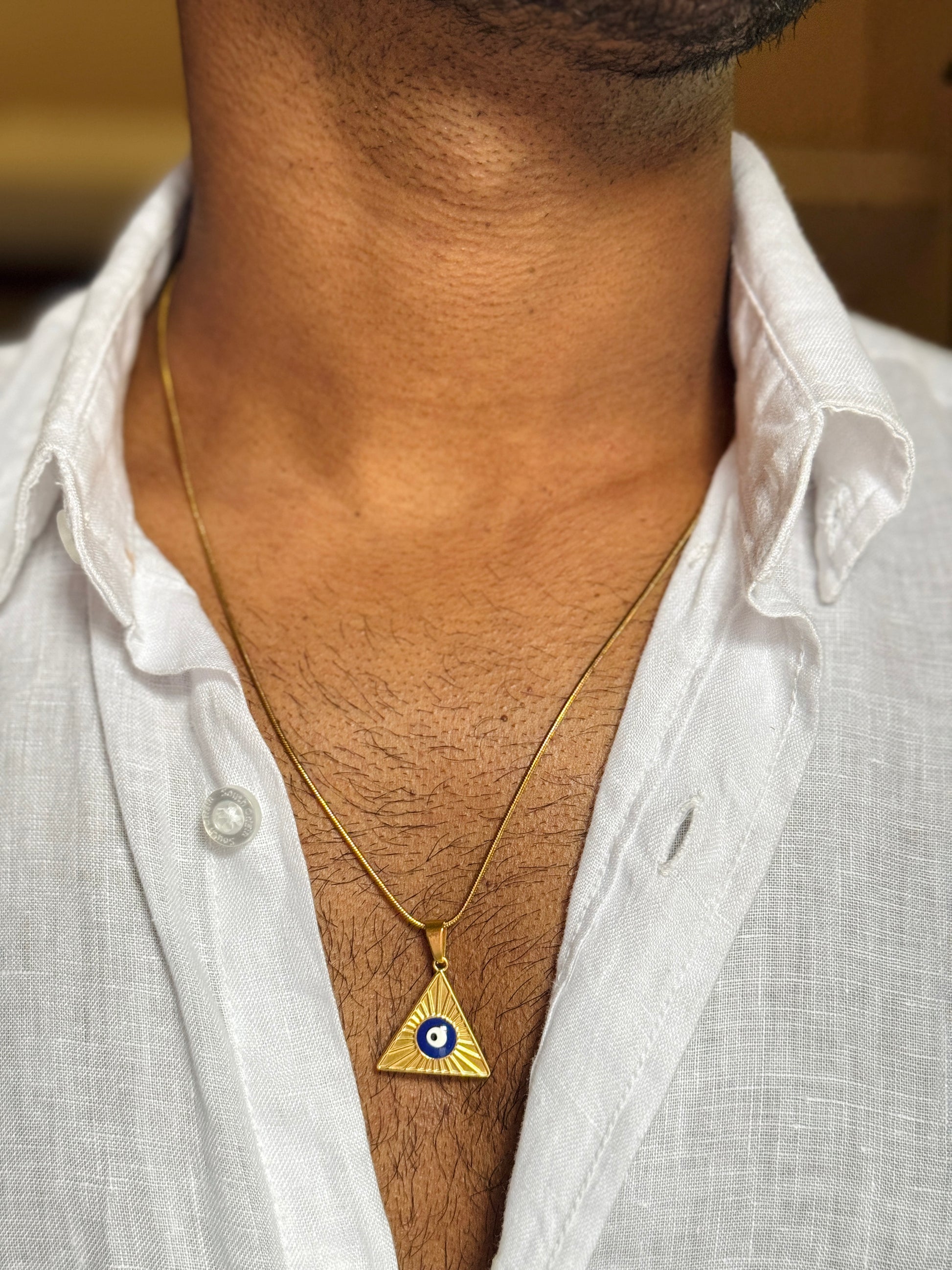 This triangle-shaped EVLI pendant symbolizes balance, strength, and protection. Paired with an 18k gold-plated stainless steel chain, it offers lasting shine, durability, and is safe for everyday wear.
